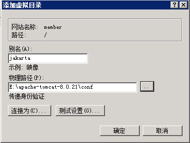 打开你的网站,鼠标单击右键添加虚拟目录,打开虚拟目录对话框。,别名为:jakarta,物理路径为:E:\apache-tomcat-8.0.21\conf